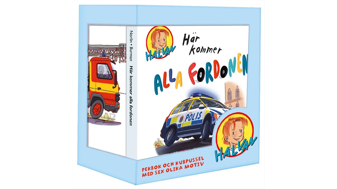 Här kommer alla fordonen är en tålig liten kartongbok där vi får träffa Halvan som kan köra brandbil, ambulans, polisbil, flygplan, långtradare och färja. Det medföljer även roliga klossar som kan byggas ihop till sex olika pusselmotiv.