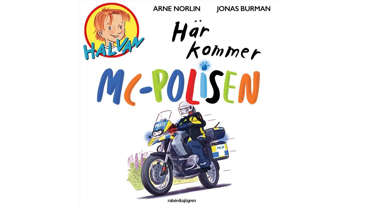 Illustratör: Jonas BurmanHalvan är tillbaka i gammal god stil från Här kommer polisbilen och Här kommer brandbilen. Det handlar om ett rån. Här flyr rånaren på en EU-moped in i parken, dit bara mc-polisen Halvan kan följa efter. Halvan övermannar rånaren och sätter handbojor på honom. I ett andra äventyr är Halvan med om en hastighetskontroll med laserpistol. En förare i en Mercedes, som kört alldeles för fort, vägrar att stanna. Men Halvan på sin mc hinner naturligtvis upp honom, det går ju inte att köra ifrån en mc-polis och allra minst Halvan! Så diskuterar mc-poliserna kortegen när Storbritanniens drottning ska komma på besök. Och så får man lära sig vad "avrostning" innebär. Det är mc-polisernas träningsdagar, direkt på våren, när is och snö försvunnit från vägarna.