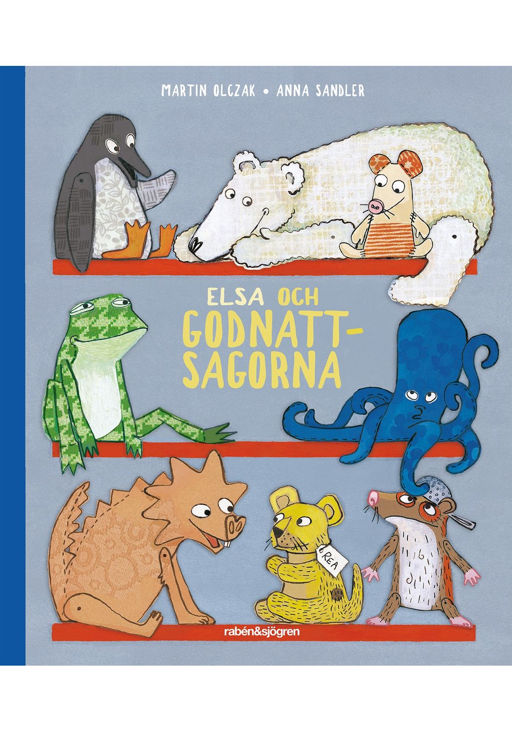 Illustratör: Anna SandlerElsa ligger i sin säng med alla gosedjuren på hyllan. Hon har svårt att somna efter att pappa har sagt god natt och gått ut. Men då vaknar alla Elsas gosedjur till liv! För att få plats i hennes sköna säng måste vart och ett av dem berätta en godnattsaga. Det blir åtta roliga och underfundiga sagor - isbjörnens, hamsterns, dinosauriens, pingvinens, musens ... Elsa får höra om Harry Hamsters kluriga fall med den mystiska kylskåpstjuven, hur det gick till när Pia Pingvin provade på att flyga och hur det kom sig att Isak Isbjörn paddlade från Nordpolen hela vägen till en strand med riktiga palmer. Till slut kan nog Elsa somna ändå.