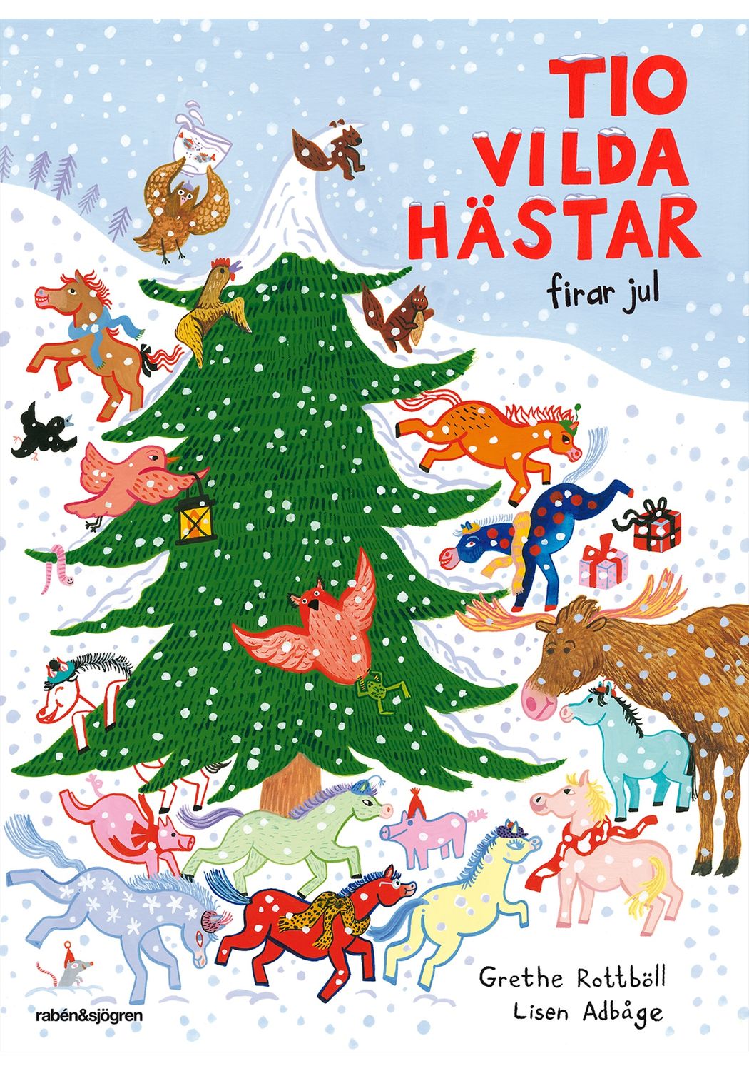 Illustratör: Lisen AdbågeNu är det jul och Tio vilda hästar bjuder in till en hejdundrande julfest. Fullt med roliga aktiviteter och bestämd julmeny. Men inga djur gillar exakt samma sak som hästarna. Maskar kan inte leka hoppa bock eller kasta hästskor, räven vill inte ha nåt mys, älgen har andra planer och fiskarna gillar inte land, så alla tackar nej till julkalas. Hästarna Doj-doj, Dolanga, Rataplan, Pistage, Minus och de andra deppar. Men så kommer de på att julen handlar ju om vänskap och att alla får vara som de vill. Och så bjuder de tio vilda hästarna in till ett nytt kalas där alla får vara som de är och fira julen som just de gillar bäst.