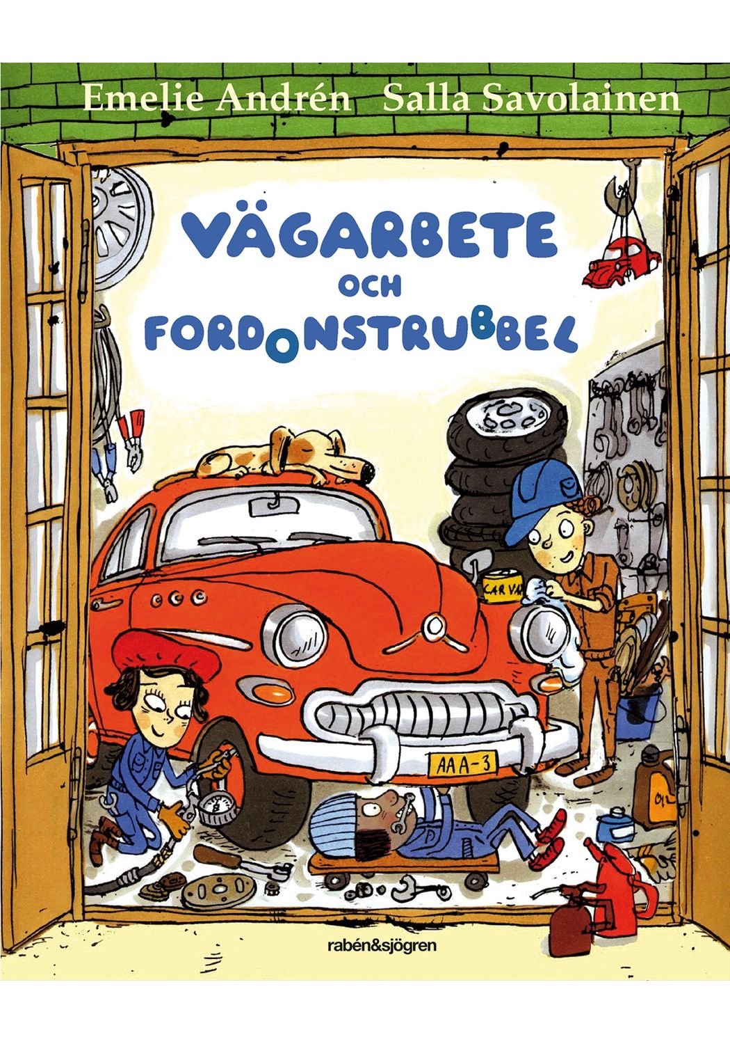 Illustratör: Salla SavolainenI utkanten av staden, där vägen slutar och skogen börjar, ligger det en trevlig bilverkstad. Där på gården står det bilvrak, trasiga mopeder och annat intressant staplat i stora högar. Astrid, Axel och Alfred som jobbar här har alltid nåt att göra, fordon som skall lagas, däck som skall bytas och bilar som har bråttom in på service.