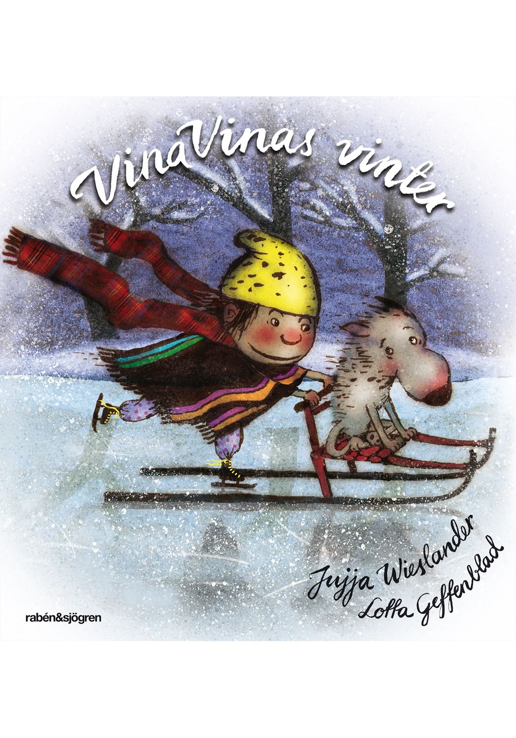 Illustratör: Lotta GeffenbladDet har blivit vinter hos Vina Vina och Varg. På sjön ligger tjock is. Vina Vina åker skridskor, Varg gillar inte skridskor. Men att sitta på Vina Vinas spark är mysigt! Fort, fort åker de på sparken. Längre och längre bort! Det blir mörkare bland träden och plötsligt är de vilse. Vilken tur att Varg har en sån bra nos att lukta med! Snart känner han doften av godis och då är hemma inte så långt borta.