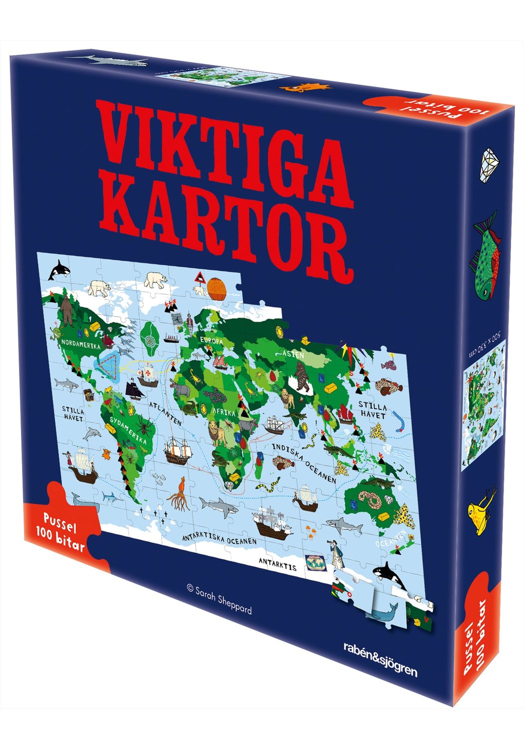 Illustratör: Sarah SheppardEtt roligt pussel på en maffig världskarta och vad som finns i världen, allt från läskiga fiskar till gnistrande diamanter, hav och länder. Boken Viktiga kartor har sålt i över 50 000 ex och kommer nu som pussel i 100 bitar av Sarah Sheppard. Ett pussel att lägga för hela familjen.