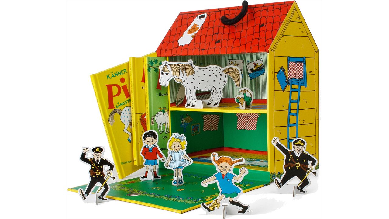 Det rymliga huset i kraftig kartong rymmer både en lekdel och tre Pippi-bilderböcker i läckert miniformat. Huset går att öppna som ett "dockskåp", och den nedfällda främre väggen blir Pippis trädgård. Inredningen är färgglad och inbjudande, och med huset följer flera stadiga pressa-ut-figurer att leka med. Dessutom finns här alltså tre fina mini-bilderböcker: Känner du Pippi Långstrump, Pippi hittar en spunk och Pippi i Humlegården.