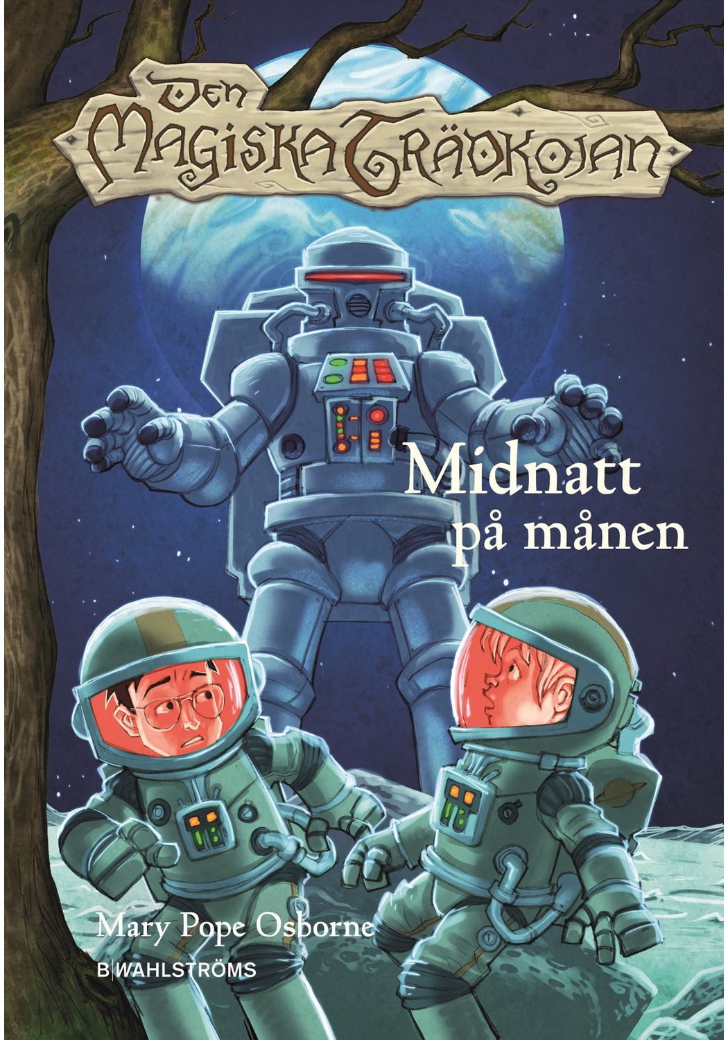 Illustratör: Sal MurdoccaDen magiska trädkojan i skogen har svept med sig Hanna och Viktor till en rymdstation på månen, och det dröjer inte länge förrän de upptäcker att de som vanligt befinner sig i en annan tid - men den här gången har de rest till framtiden! De tar på sig rymddräkter och utforskar tyngdlösheten och kratrarna. Snart hittar de en månbil och ger sig ut på en vild åktur på månens yta. Men vem är den mystiska astronauten som de träffar på? Och kommer de hinna tillbaka till rymdstationen innan syret i gastuberna tar slut?