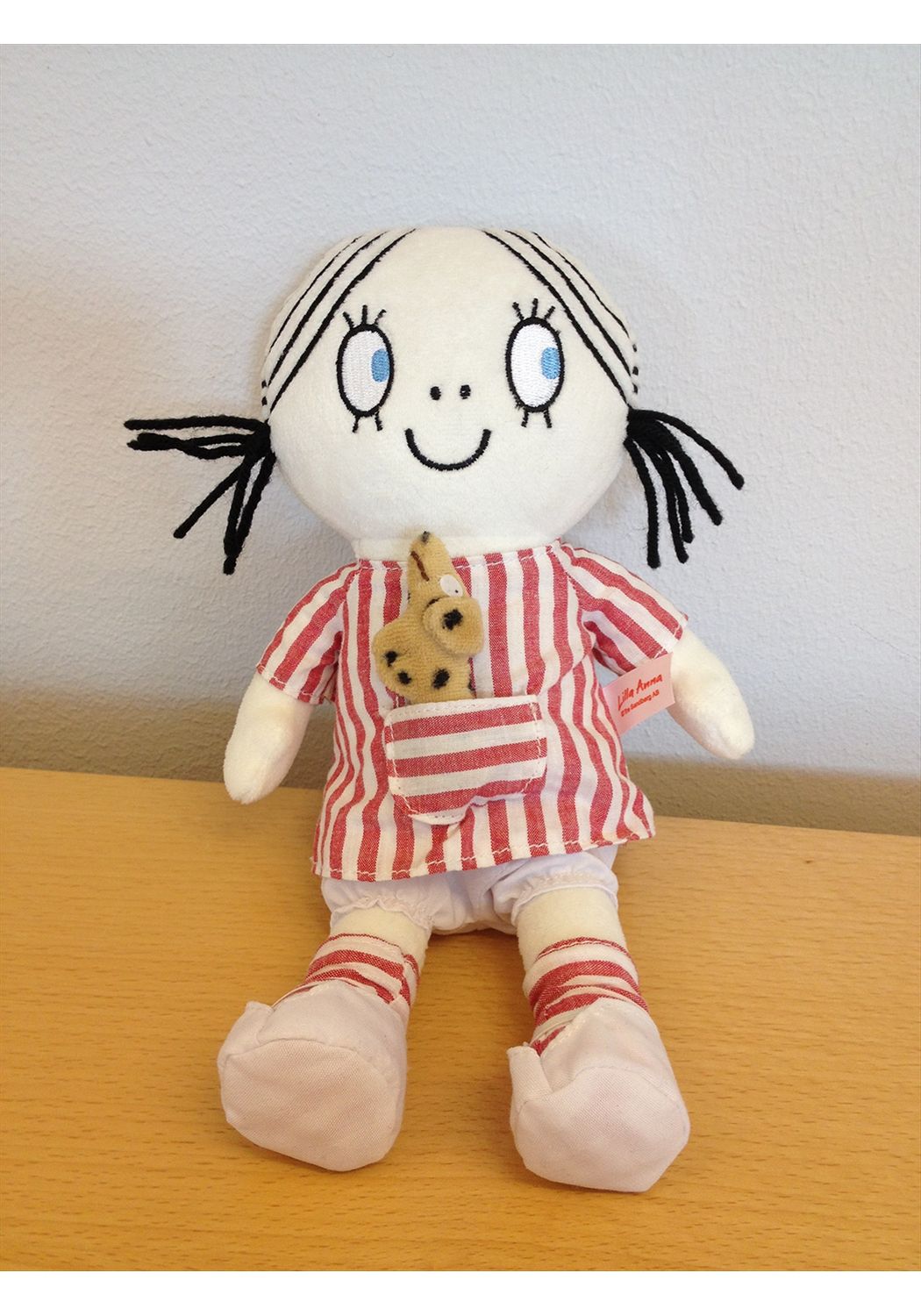 Greppvänlig och fin docka i mjukt tyg. Lilla Annas rödrandiga klänning, strumpor och skor är avtagbara. Till dockan följer en liten hund som passar precis i Lilla Annas ficka.