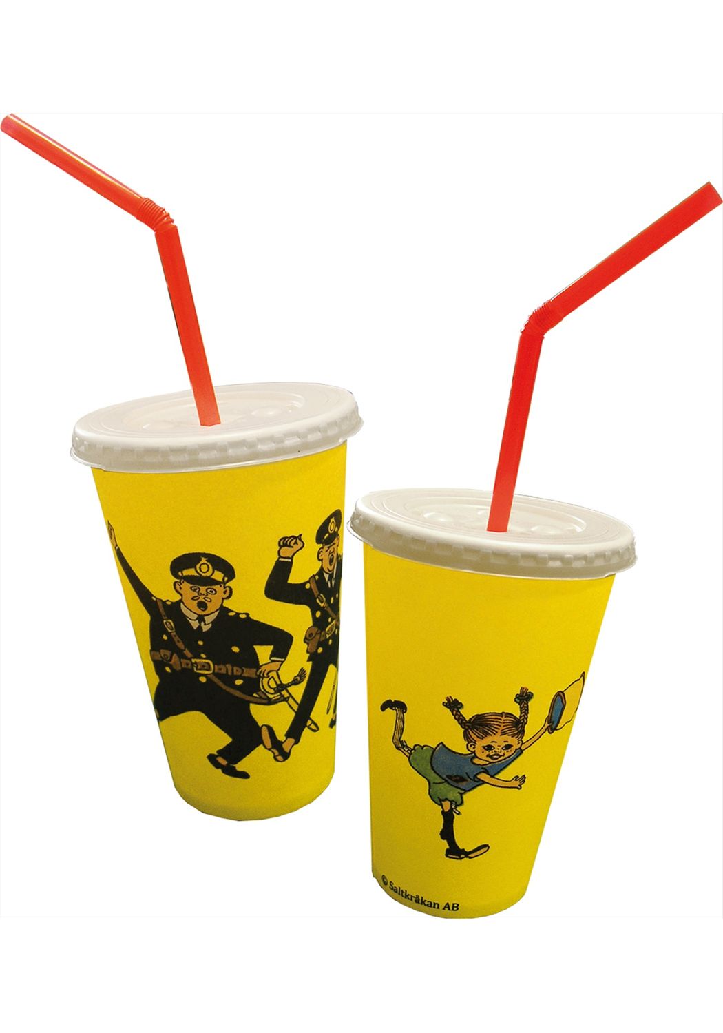 Duka bordet med Pippi Långstrump och hennes vänners fina kalasmuggar! Praktiska plastmuggar med tippsäkert lock och sugrör. 10-pack.