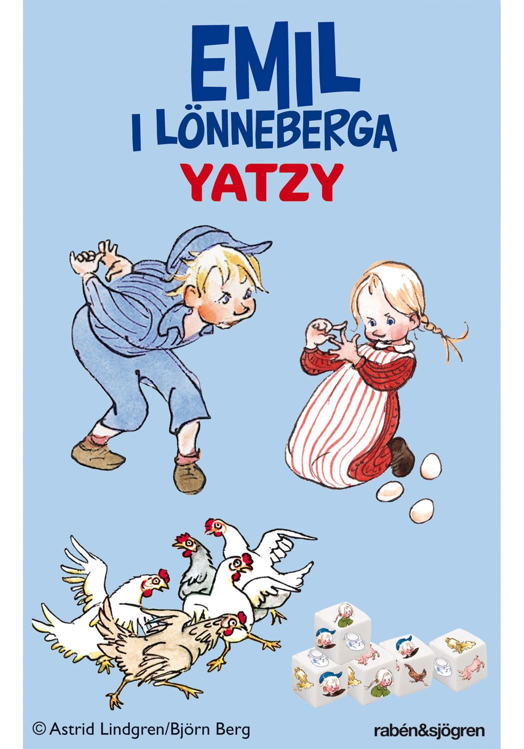 Illustratör: Björn BergEmils yatzy är ett roligt tärningsspel för två till sex spelare. I stället för siffror har tärningarna bilder på Emil, Ida, griseknoen och andra kära Emilkaraktärer. Kasta tärningarna och försök att få bildkombinationer som ger så höga poäng som möjligt.