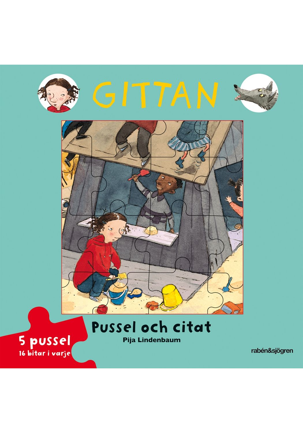 Fem Gittan-favoriter som pussel, med citat från böckerna. Sexton bitar i varje pussel.