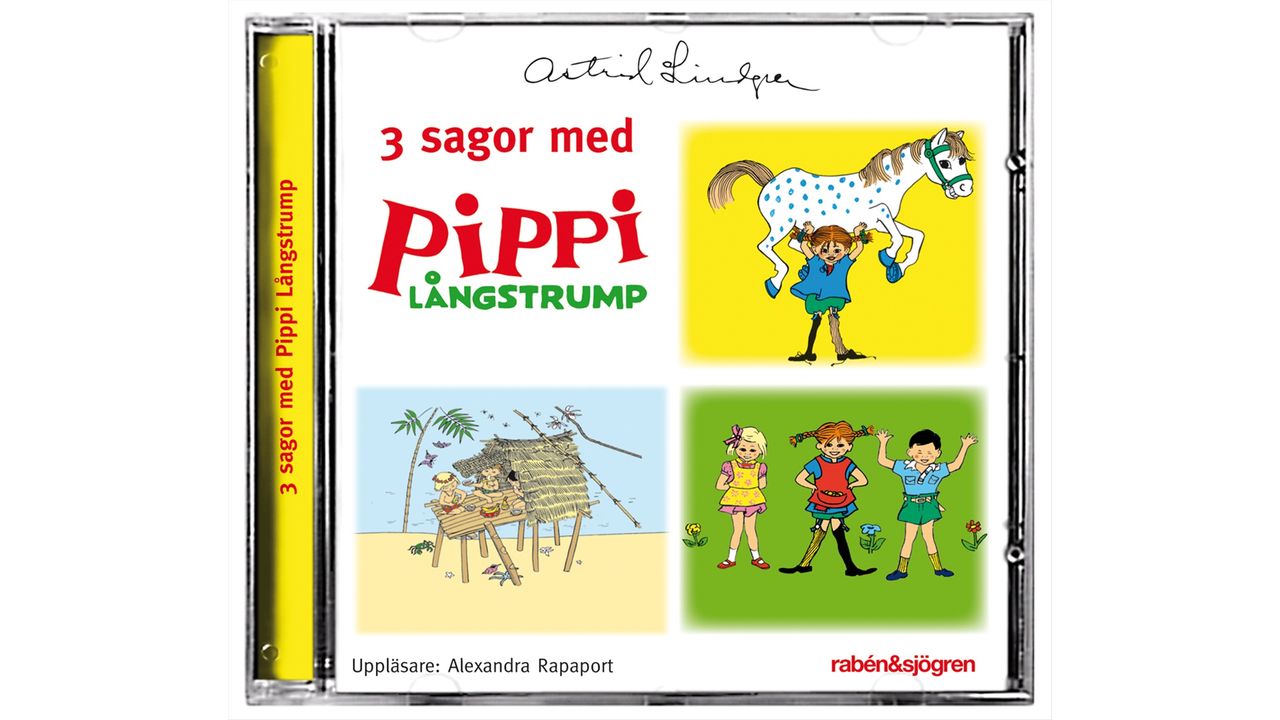 En cd med tre berättelser om Pippi Långstrump, inlästa av Alexandra Rapaport.