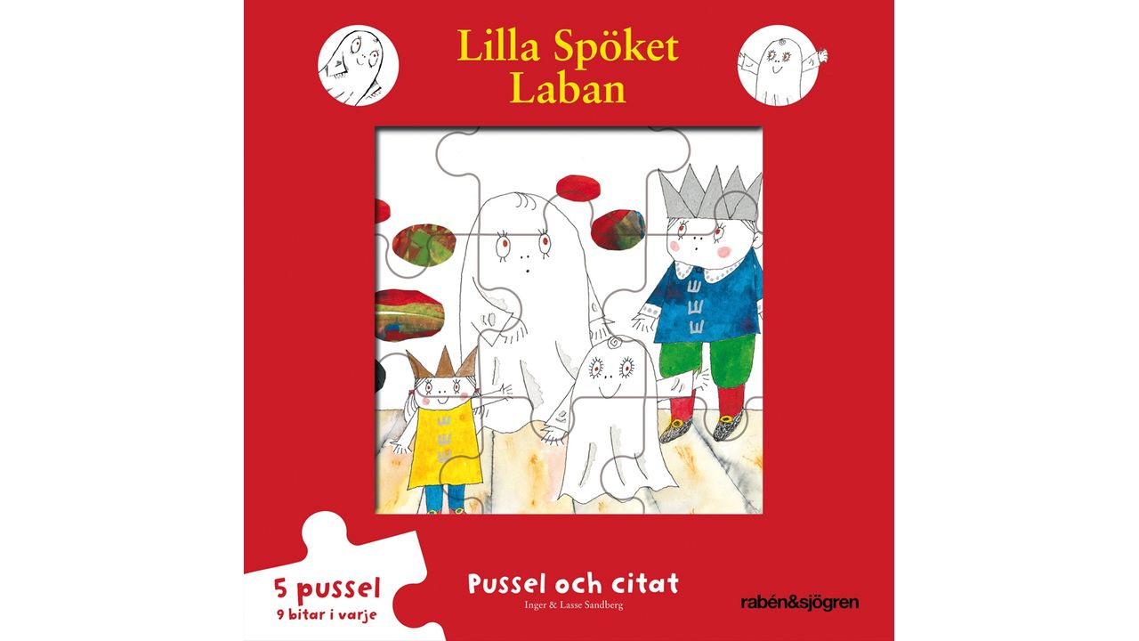 Pussla ihop bilder ur Lilla Spöket Labans värld. Fem stycken 9-bitars pussel med välkända Labanmotiv i ett roligt format som ser ut som en bilderbok.