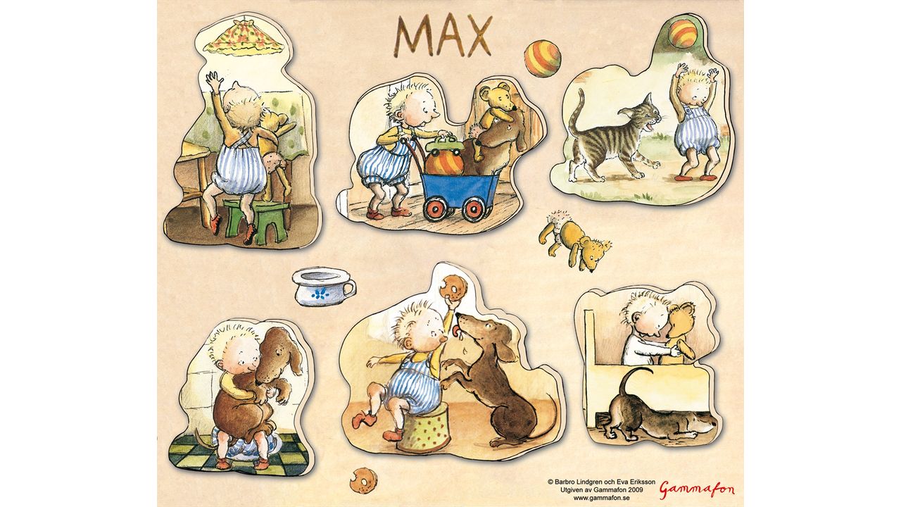 Illustratör: Eva ErikssonBabypussel av trä med illustrationer ur Maxböckerna. Urfasning på ena sidan så barnen lätt kan få upp bitarna.