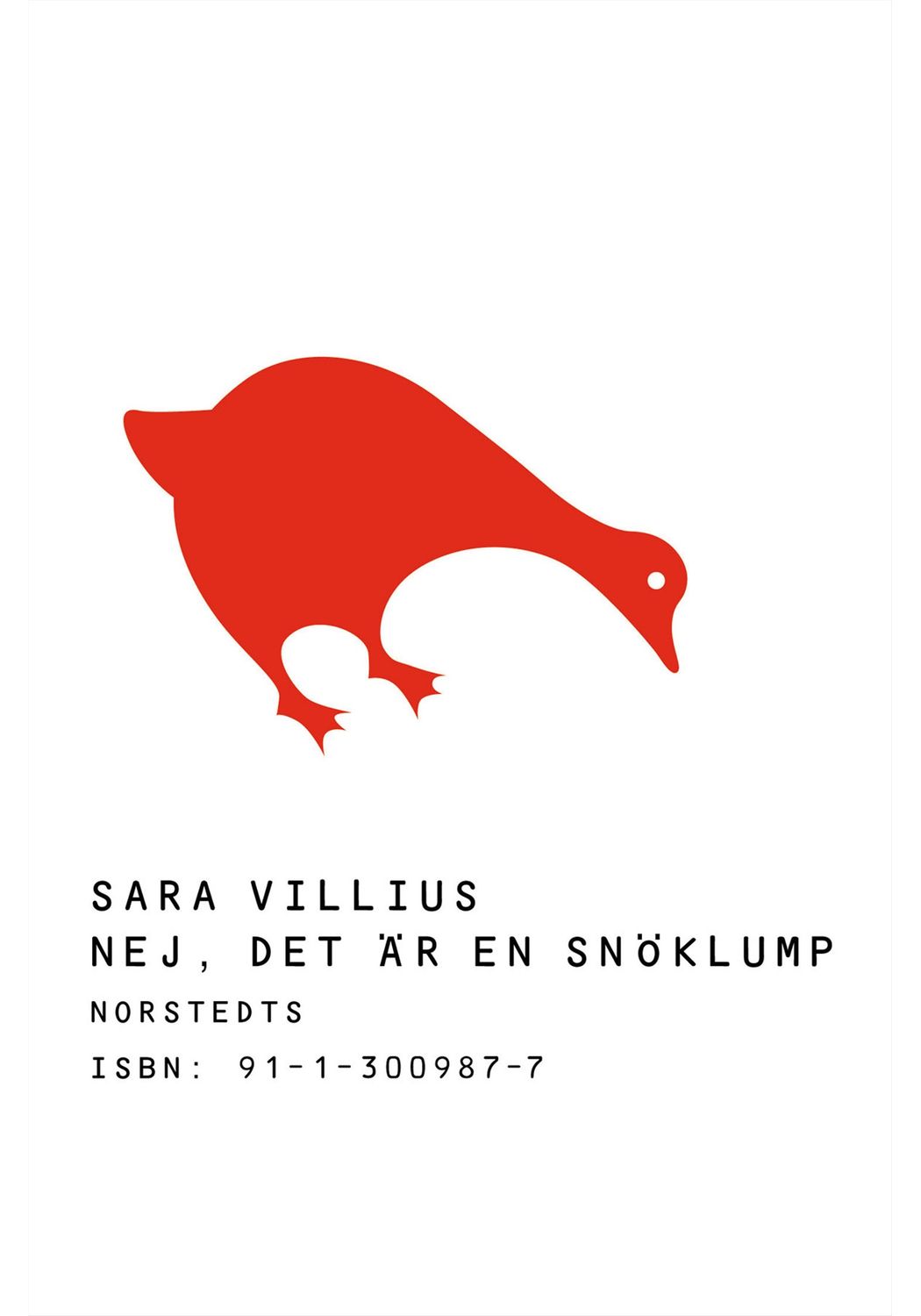 Sara Villius debutbok, Nej, det är en snöklump, handlar om en outsider, en flicka som är lite på kant med hela tillvaron. Hon pepprar sitt språk med attityd, men det finns något väldigt sorgligt bakom både huvudpersonens attityd och berättelse. Boken utspelar sig under en bilfärd till Öland. Men här finns också korta tillbakablickar om akademikerföräldrarna, pojkvännerna, hångel och ensamhet. Den enkla stilen är skenbart naiv med en absurd och ironisk humor.