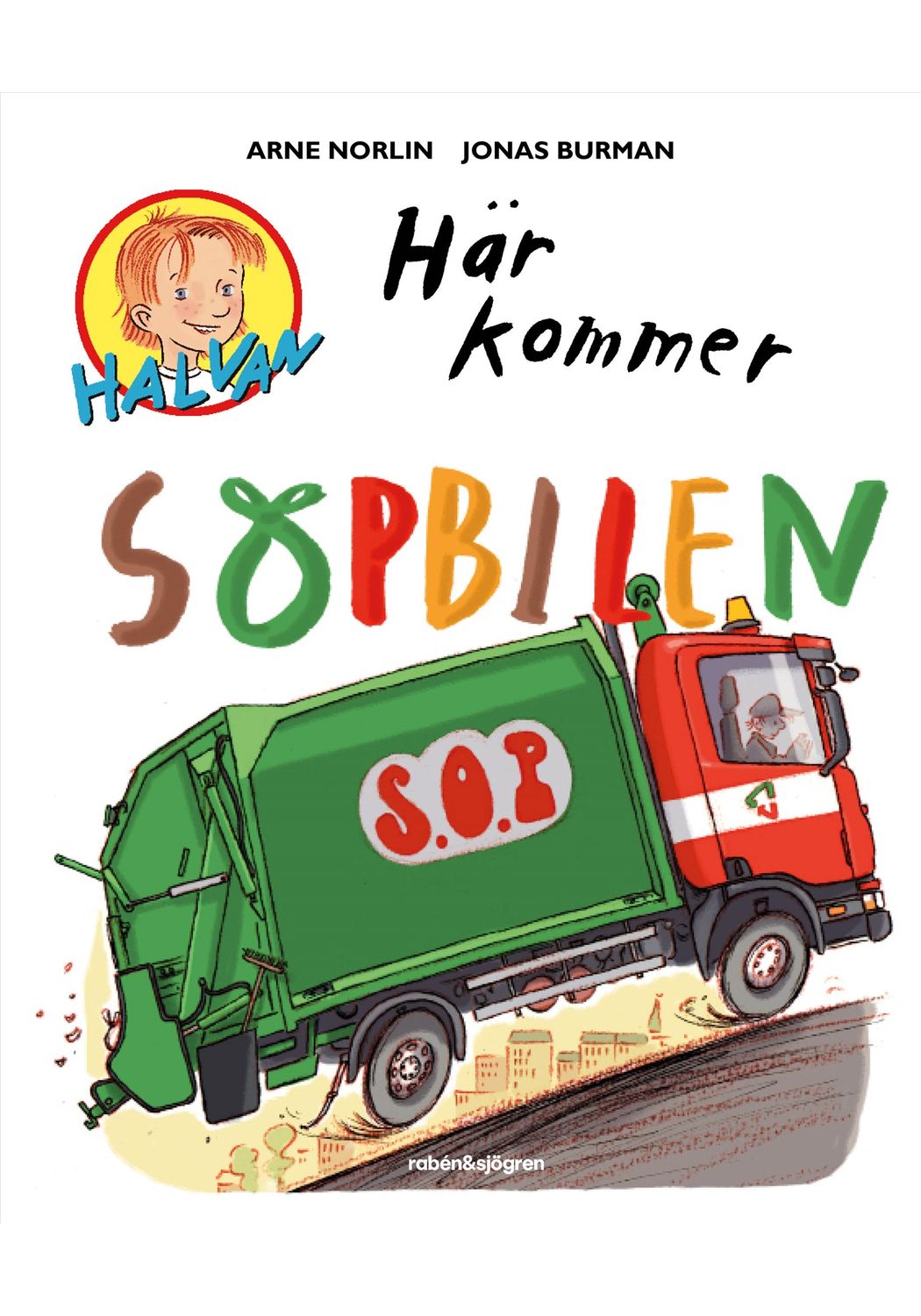 Illustratör: Jonas BurmanNu är Halvan renhållningsarbetare och kör en färggrann sopbil över hela stan.