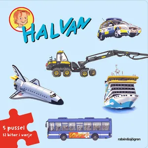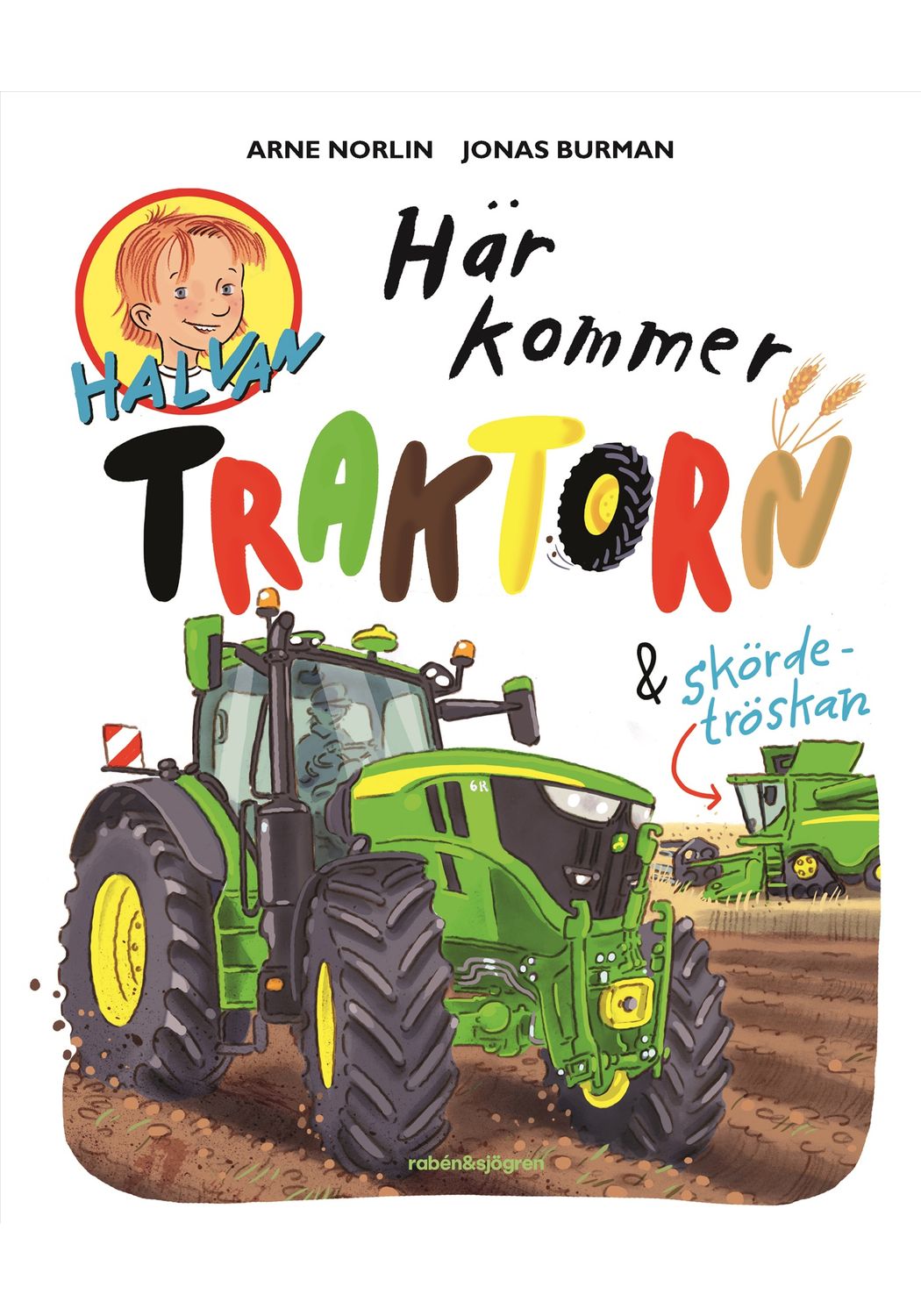 Illustratör: Jonas BurmanTänk dig att få köra en riktig, stor traktor. Det gör Halvan, han har en grön fin traktor med tre tillbehör: en skopa, en kärra och en balpress. Traktorn väger 8,5 ton, det är lika mycket som sex personbilar. Och den är dubbelt så lång som en bil. För att komma upp till hytten, som sitter en och en halv meter upp, måste man klättra på en trappstege. Bakhjulen är två meter i diameter och väger sexhundra kilo var. Framhjulen är nästan lika stora. Som jordbrukare behöver man många verktyg och fordon för att sköta om gården och djuren. På hösten skördar Halvan sina åkrar med en stor skördetröska. Och på våren upptäcker han att de behöver hjälpa en av lammungarna som inte kan äta ordentligt, Halvan och hans familj flaskmatar och tar hand om lammet så hon blir stor och stark. Lär dig om livet på en bondgård och om alla maskiner och fordon som används där.