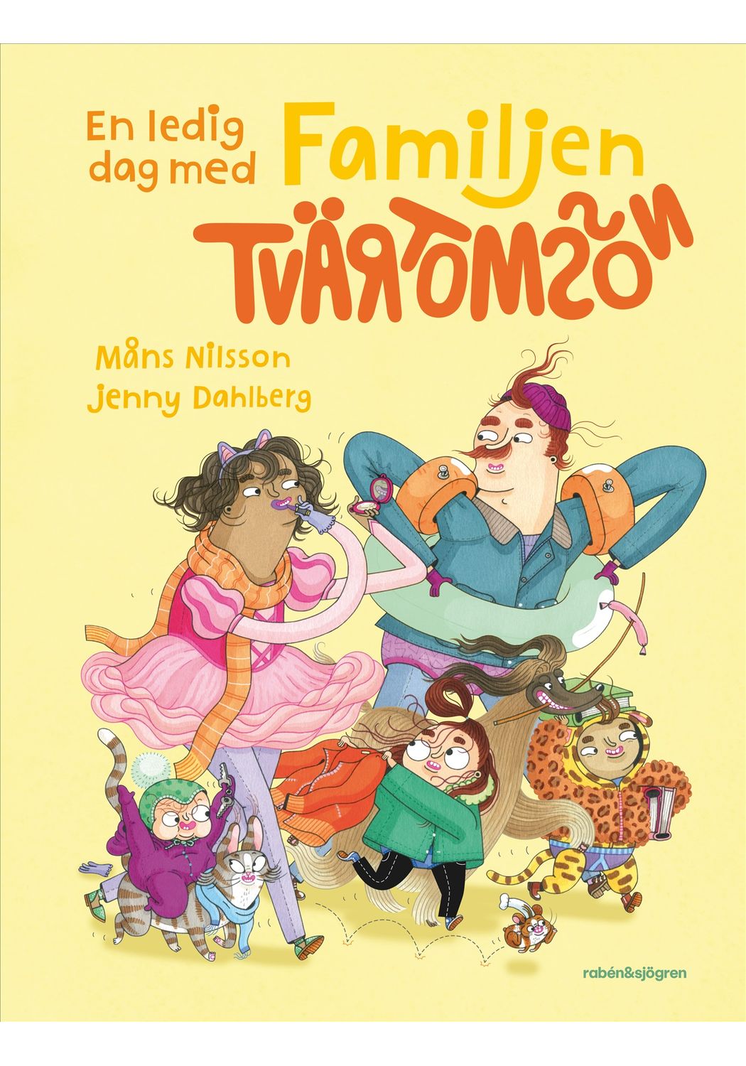 Illustratör: Jenny DahlbergDet här är familjen Tvärtomsson - en helt vanlig familj som har kalsongerna utanpå byxorna, precis som alla andra. Det är helg och då ska familjen hitta på något riktigt roligt, bestämmer barnen. Det blir storstädning! NEEEEJ, skriker föräldrarna, de vill gå till badhuset och dinosauriemuseum! Okej, suckar barnen, men först måste föräldrarna få på sig skor och jacka, och det tar en evig tid. På badhuset måste man springa, så man inte ramlar och slår sig, och på museet får man gärna pilla och klättra på allt - särskilt det uråldriga dinosaurieskelettet. Väl hemma är det dags att mysa på extra hårda stolar framför nyheterna, tycker barnen. Men mamma vill bara kolla på Mello, och plötsligt är pappas skärmtid slut! Hur ska det gå?