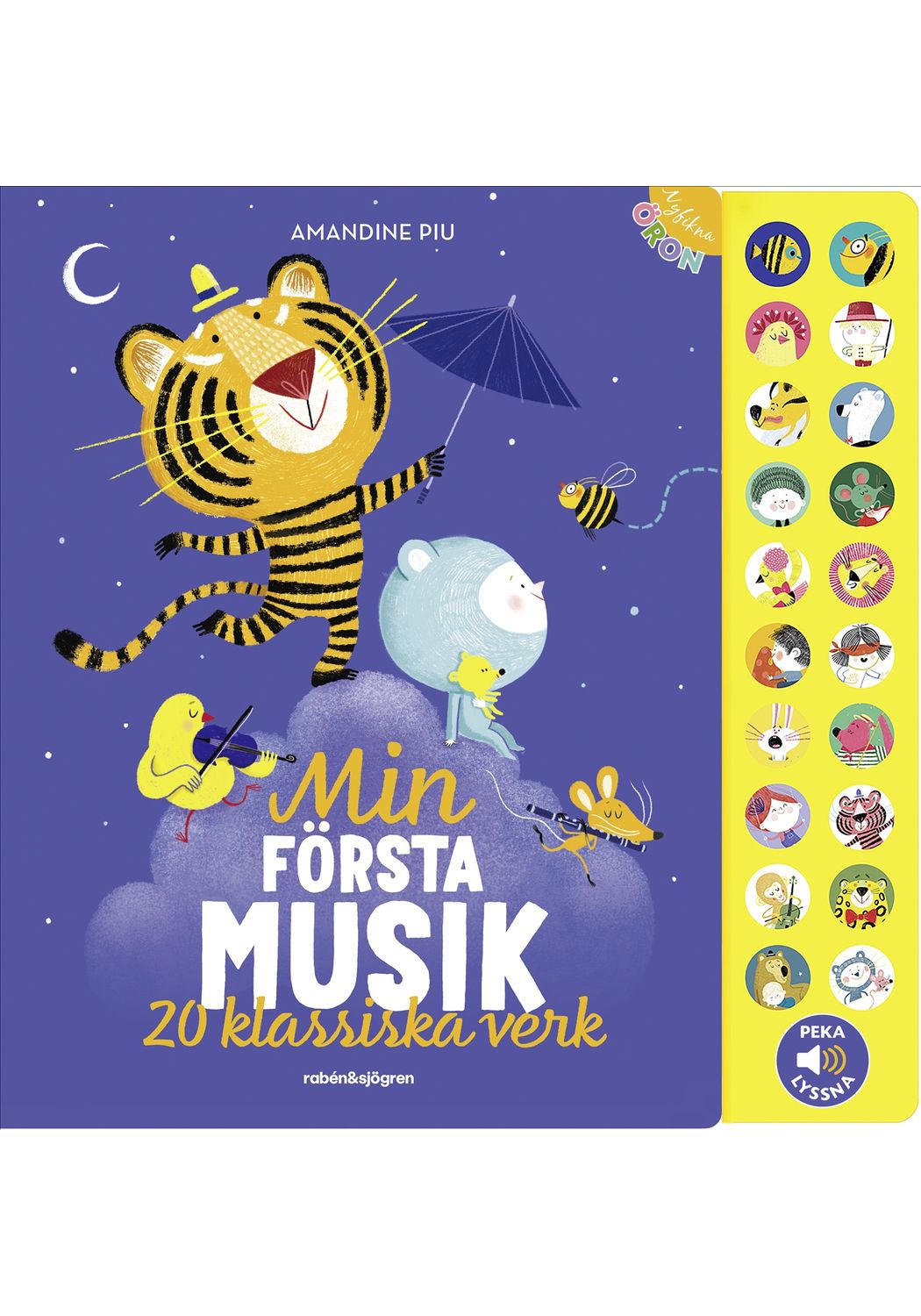 En stor bilderbok i stadig kartong med roliga, färgstarka bilder. Tryck på knappen och lyssna på välkänd musik av några av de största kompositörerna: Mozart, Vivaldi, Strauss, Schubert och Tjajkovskij. Barnets första musikaliska upplevelse!
